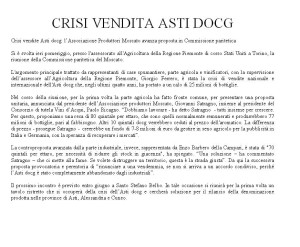 L'argomento principale trattato da rappresentanti di case spumantiere, parte agricola e vinificatori, con la supervisione dell’assessore all’Agricoltura della Regione Piemonte, Giorgio Ferrero, è stata la crisi di vendite nazionale e internazionale dell'Asti docg che, negli ultimi quatto anni, ha portato a un calo di 25 milioni di bottiglie.