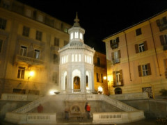 Dietro i vapori salutari che si alzano verso il cielo fa capolino l’edicola ottagonale, eretta, nel 1870, a forma de tempietto greco dall’architetto Giovanni Cerrutti.
